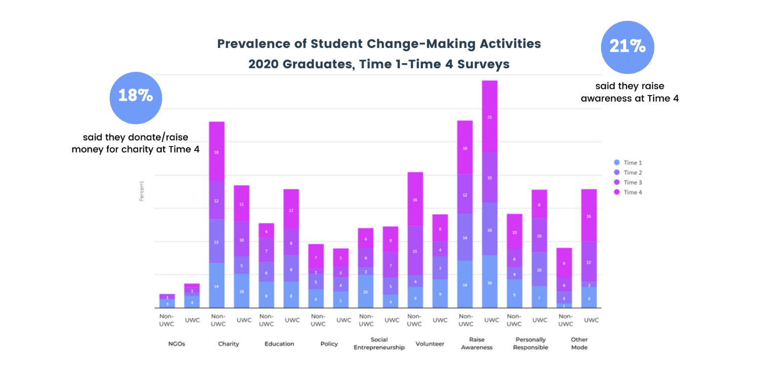 In particular, we specifically asked about types of actions in our surveys with students and alumni. You can see the types of changemaking activities they reported here: