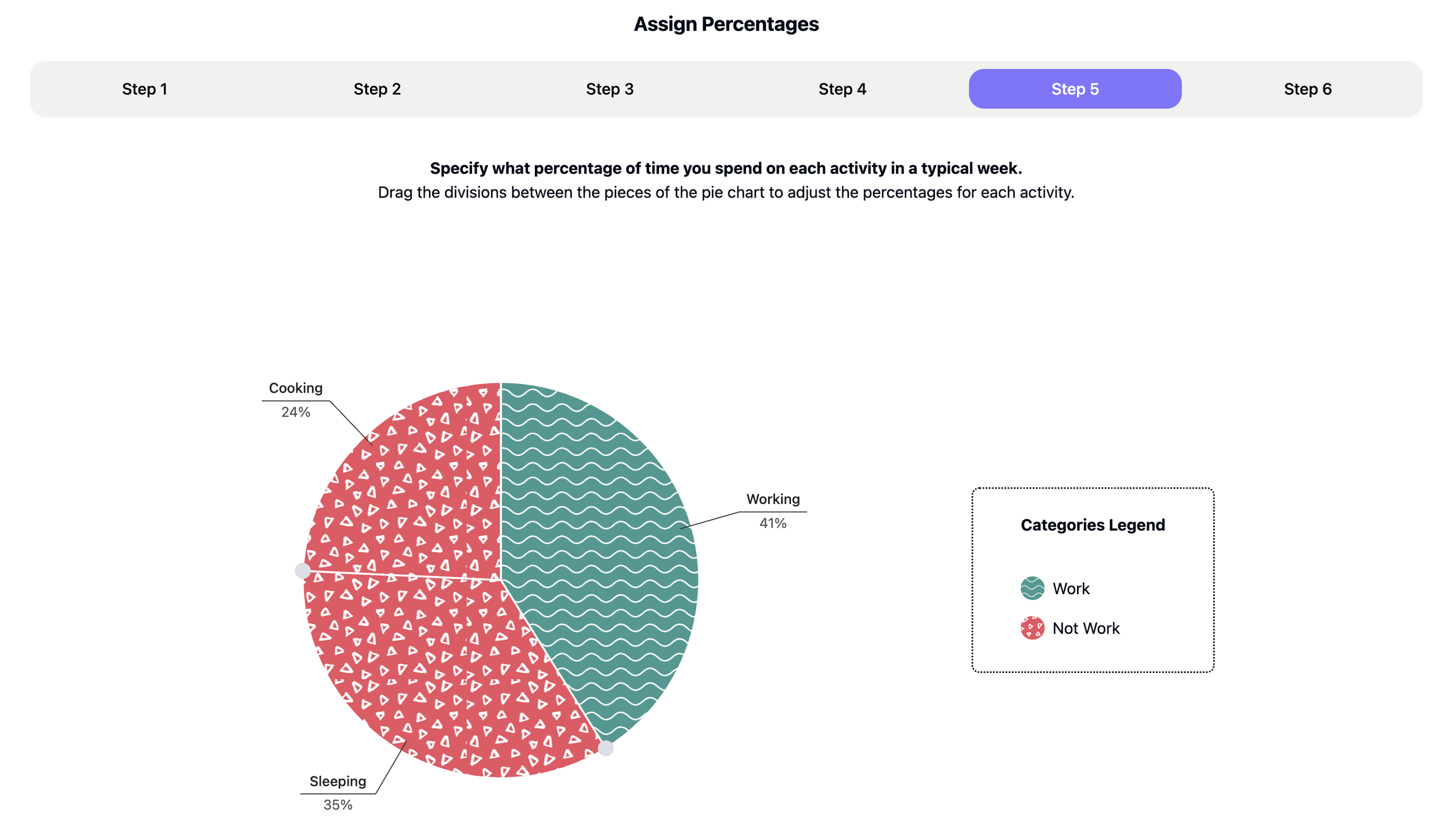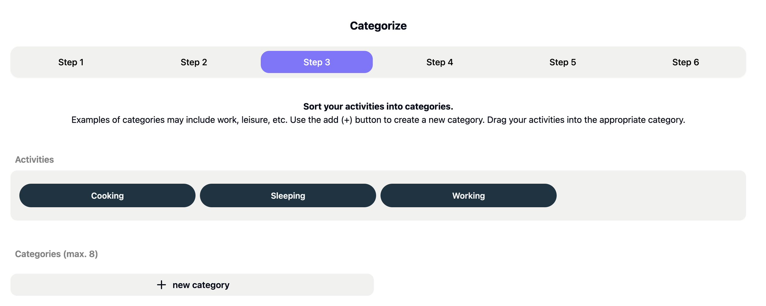 Begin by listing the various ways you spend your time. You will be asked to select your previously completed value sort. You’ll then be asked to add activities, then asked to sort those activities into categories, considering the amount of time you devote to each. You will then have the opportunity to reflect on the relationship between your values and how you spend your time.